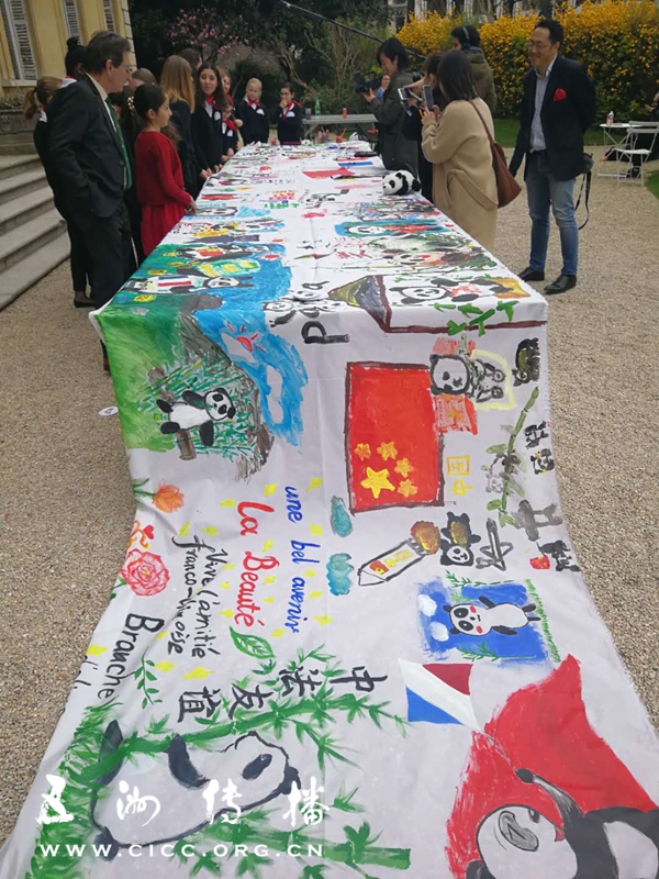 活动现场,来自中法两国的青年学生代表上台展现合作绘画巨幅环保作品《飞吧,熊猫风筝!》,并邀请来自全球设计爱好者和专业人士参与“中国大熊猫国际形象全球招募”。