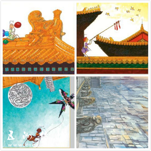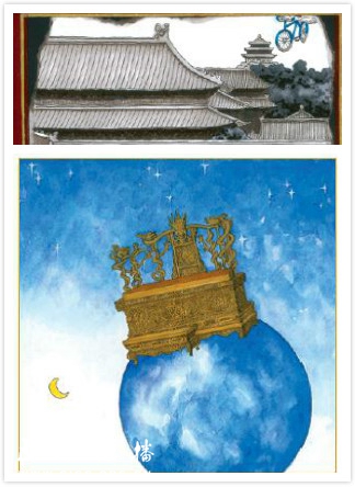 书中的手绘插画或绚烂华美,或朴素隽永,或充满童趣,或悠扬抒情。既有写实风格也有呆萌可爱的q版风格,还有超现实的大胆创意和想象,如宫殿上空掠过的自行车、飞上太空的金銮宝座、被关进鸟笼的太监……现实的场景和幻想的画面交替穿插,亦真亦幻,带来不可思议的视觉震撼!紫禁城在她的笔下活了!