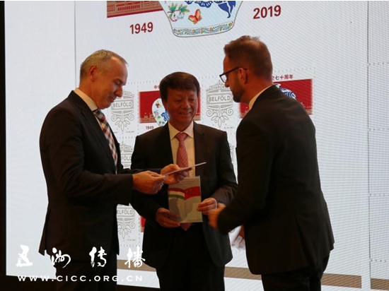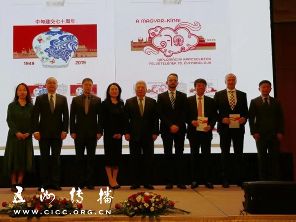 在首播仪式现场,匈牙利国家邮政总局的冒洛然•伊姆莱把中匈建交70周年纪念邮票赠送给了双方领导。