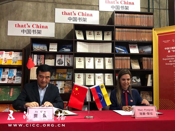 中国国际图书贸易集团公司副总经理贾强先生与南方书店负责人玛丽·彭让女士签署中国主题图书委内瑞拉巡展暨“中国书架”合作协议