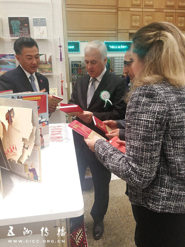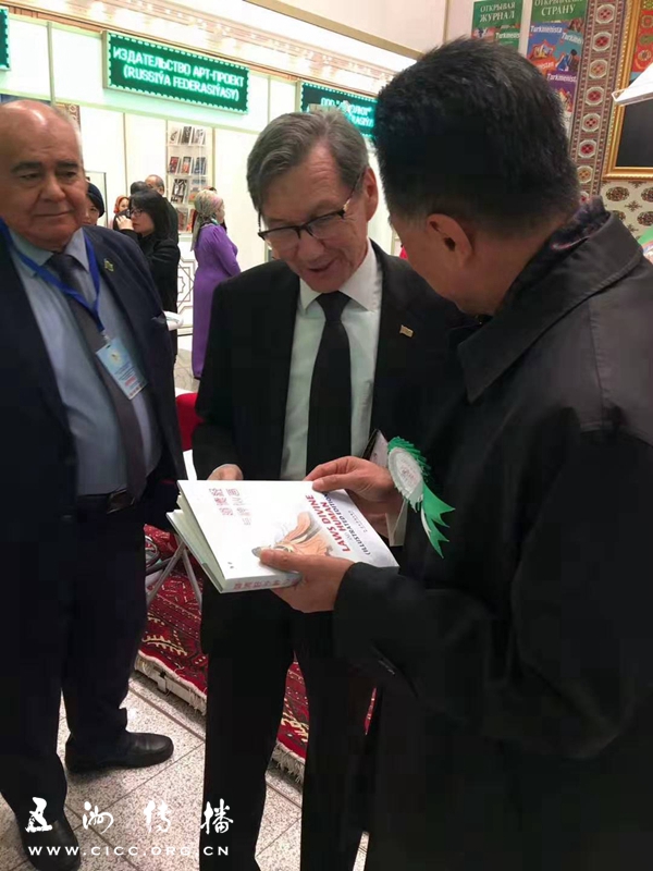 11月5日,驻土库曼斯坦大使孙炜东专门来到会场会见中国出版代表团并接受赠书,就中土双方出版及文化合作进行了深入交流。