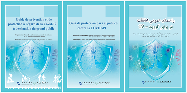 《新型冠状病毒肺炎公众防护手册》法、西、波斯文版(从左至右)