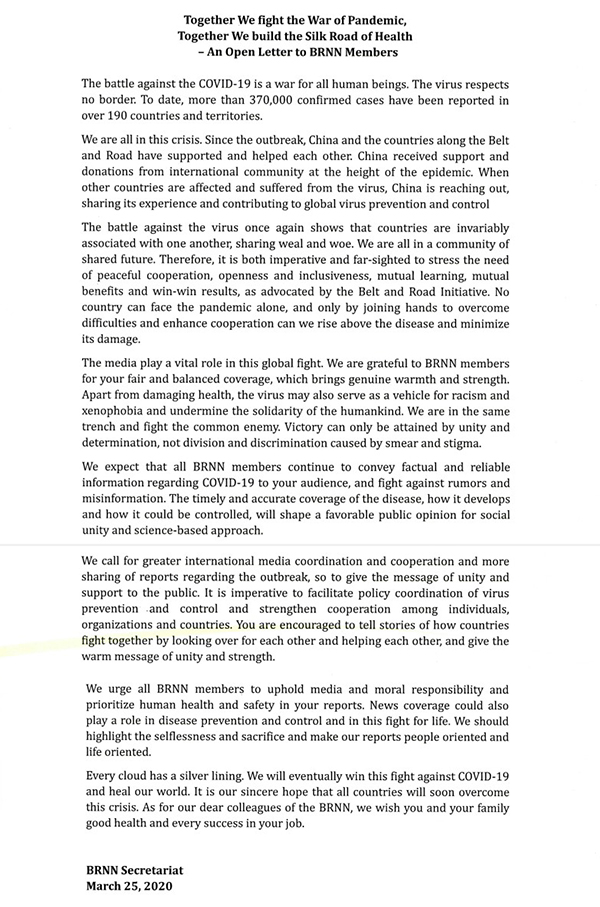 共筑抗疫防线 共建健康丝路——致“一带一路”新闻合作联盟成员公开信