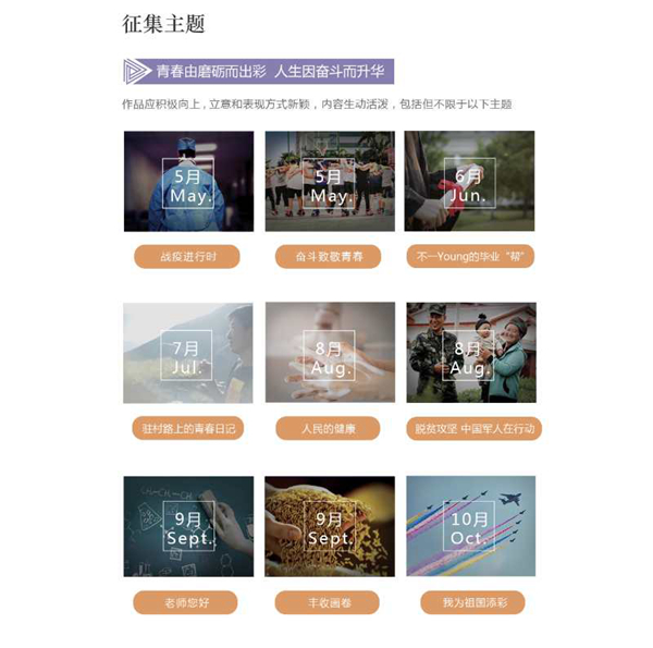 即日起至10月下旬,本届大赛面向社会广泛征集优秀融媒体作品。参赛作品分为短视频和交互融合作品两大类,内容要求紧扣主题,积极向上,立意和表现方式新颖,语言生动活泼。大赛组委会按月份设置“战疫进行时”“奋斗致敬青春”“不一Young的毕业‘帮’”“驻村路上的青春日记”“人民的健康”“脱贫攻坚,中国军人在行动”“老师您好”“丰收画卷”“我为祖国添彩”等主题进行作品征集,鼓励创作者运用航拍、VR、AR、手绘、沙画等富有创意的手段,反映年轻人对新时代的生动理解,以更接地气的表达和更有活力的方式传播青年正能量,弘扬真善美。