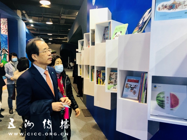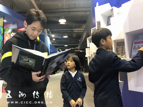 小读者和嘉宾在五洲传播中心提供的儿童图书区驻足。
