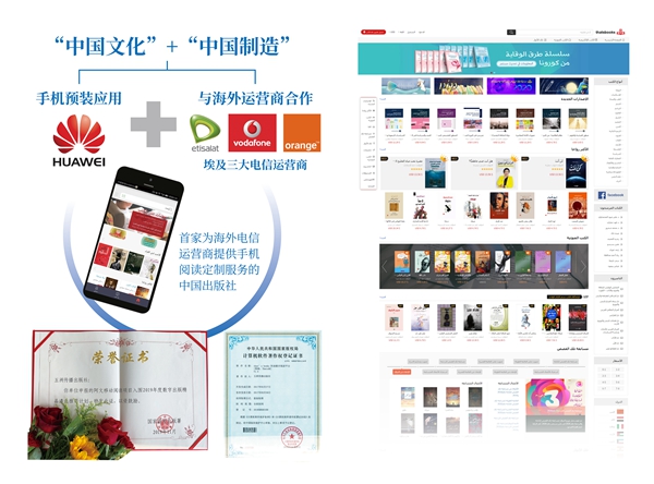 2017年至2019年,通过市场招标,与华为合作为埃及三大电信运营商(Vodafone、Orange和Etisalat)的用户提供手机阅读服务,五洲传播出版社成为中国第一家为海外运营商提供阅读服务的出版社。截至到目前,??? ?????APP在谷歌市场的下载量超过540万次,月活跃用户约80万,平台日均访问量5万。该项目入选国家新闻出版总署“2019年度数字出版精品选荐计划”。