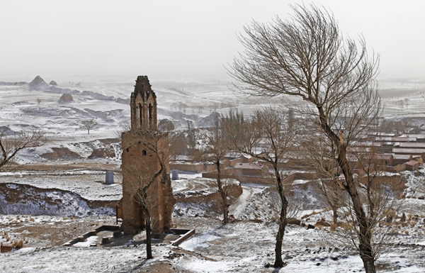 八台子村,近处的教堂遗址和远处的长城遗址