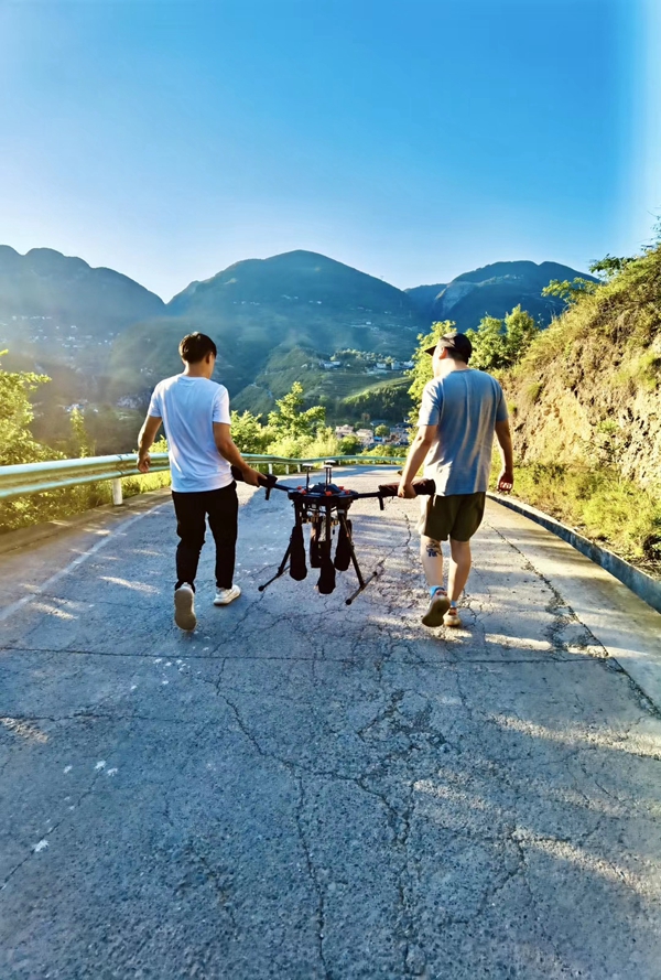 在拍摄《通途》的过程中,为呈现村民在鸡鸣三省大桥开通前的生活状况,拍摄小组跟着主人公余婆婆重现翻山渡河至对岸孙女家的情景。此时,沉重的拍摄设备成了沿途最大的阻碍,组内的小伙子们扛着百余斤的设备器材,一路跋山涉水跨越四川、云南、贵州三省,翻过崎岖的山路,穿过险峻的栈道,渡过湍急的河流。