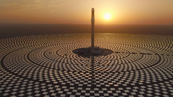 图为敦煌百兆瓦熔盐塔式光热电站,可24小时连续发电