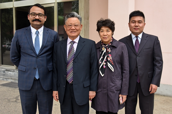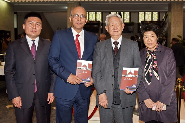 本书作者陆树林大使(右2)、巴基斯坦驻华大使莫因·哈克和五洲传播出版社副社长荆孝敏(右1)等合影/摄影 杜辉煌