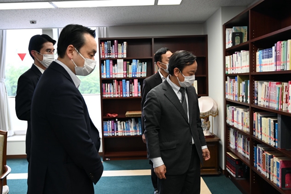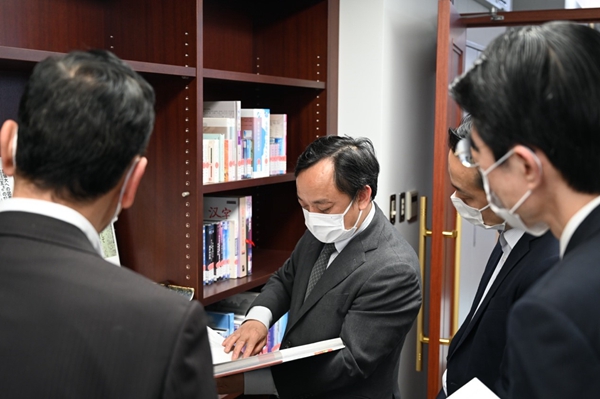 创价大学位于东京郊外八王子,时值初夏,校园内郁郁葱葱。我们走进中央图书馆4层,宽敞的阅览大厅出现在我们面前。尽管东京仍处于新冠疫情高峰期,大厅还有一些学生在边查阅图书边在电脑上书写着什么。创价大学国际部副部长兼北京事务所事务长川上喜彦、课长藤本英一、副课长横田地秒一行早早就在等候。他们热情地带我们参观中国馆。