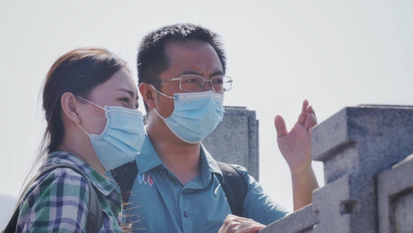图为三峡大坝坛子岭上,胡胜丰给占苏丽讲解电站运行原理