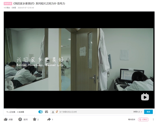 中国新疆网官方账号于2020年7月在哔哩哔哩视频平台报送《"我的家乡更美好"系列短片》参赛并进行了多平台推送传播?;窠庇捌诒敬位疃偻?、B站、抖音、新浪微博、东方明珠移动电视、地铁电视、东方社区信息苑等媒体平台进行了展播展映,并获得一致好评。(中国新疆网 张思涵供稿)