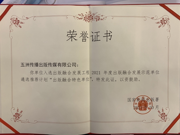 10月21日,国家新闻出版署官网发布通知,公布了出版融合发展工程2021年度入选项目和单位,五洲传播出版传媒有限公司入选出版融合特色单位。