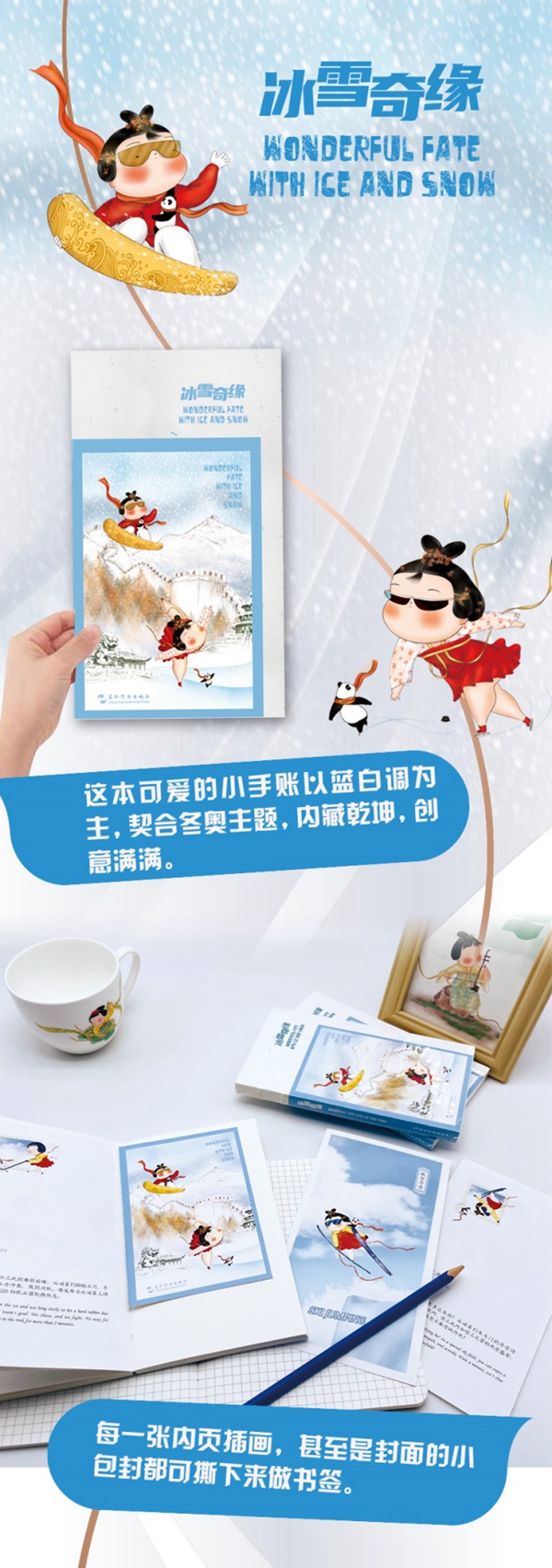 为迎接即将举办的2022年北京冬奥会,五洲传播出版传媒有限公司特别推出《冰雪奇缘》冬奥双语手账。手账以蓝白色调为主,配有中英双语简介,将小红书网红“唐风肉肉”化身冰雪健将,向读者展示了冬奥会中的14项常规比赛项目。