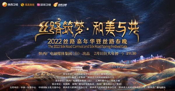 “丝路筑梦·和美与共”——2022丝路嘉年华暨丝路春晚将于2月1日(大年初一)起通过陕西卫视、凤凰卫视、深圳卫视、海南卫视、优酷、腾讯视频,以及五大洲12个国家的媒体播出。晚会由国务院新闻办公室、国家广播电视总局指导,紫荆文化集团、陕西省人民政府新闻办主办,五洲传播中心、陕西广电融媒体集团(台)、凤凰卫视联合承办。
