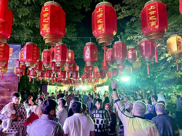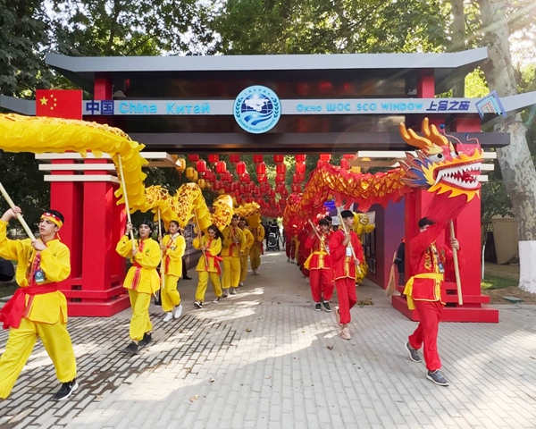 在上海合作组织成员国元首理事会第二十二次会议召开之际,由国务院新闻办公室指导,乌兹别克斯坦旅游和文化遗产部、乌兹别克斯坦驻中国大使馆、五洲传播中心、上海合作组织睦邻友好合作委员会和上海艺博会国际展览有限公司联合主办的“上海合作组织国家青少年画展”于9月14日至20日在撒马尔罕著名的大学路展出。展区入口处双龙起舞,双狮欢跃,现场一派生气勃勃的喜庆氛围。