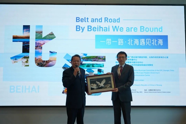 北海市委宣传部常务副部长苏远信代表北海市政府向吉隆坡中国文化中心赠送北海礼物