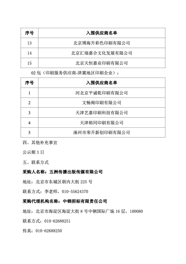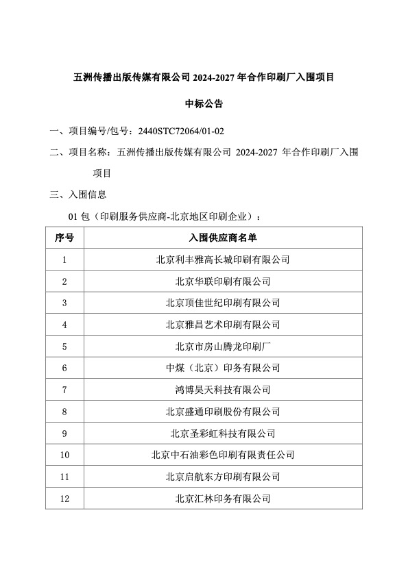 五洲传播出版传媒有限公司2024-2027年合作印刷厂入围项目中标公告
