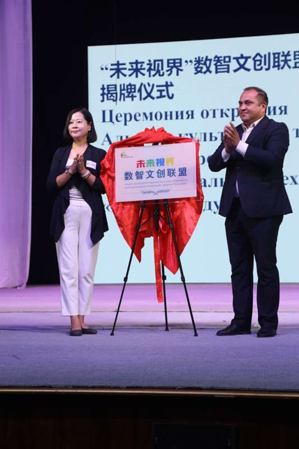 随后,现场观众共同见证“未来视界”数智文创联盟成立。该联盟旨在汇聚中乌乃至全球范围内的出版社、青少年文艺团体、文化创意品牌等,通过数字化与智能化的手段,共同探索跨文化合作的新模式、新路径。撒马尔罕州文化厅厅长哈伊托夫与五洲传播中心文化交流中心主任黄静共同为联盟铭牌揭牌。