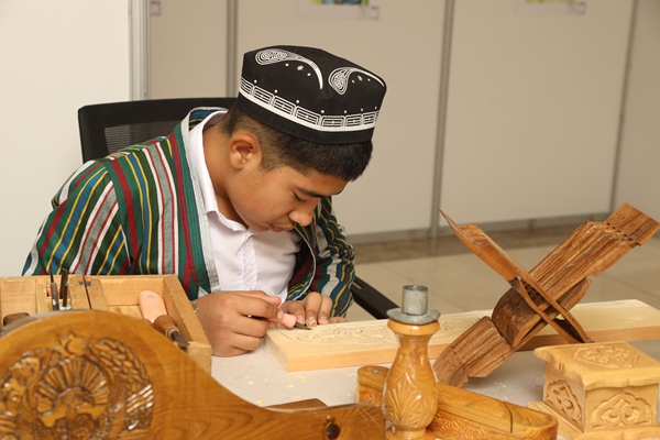 乌兹别克斯坦青少年手工艺者正在制作木雕