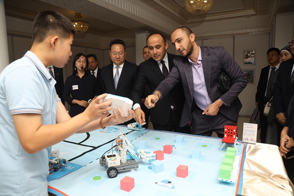 活动伊始,到场嘉宾共同参观了“未来世界”国际青少年艺术作品展和“未来视界”数智文创展。本次艺术作品展汇聚了中国、乌兹别克斯坦及全球其他国家逾三百件青少年及青年艺术家的作品,涵盖绘画、书法和工艺美术等多个类别。作品题材多元,涉及科技创新、文化遗产?;び氪小⑽拿鞫嘌杂虢涣骰ゼ?、全球共同议题等主题。年轻的创作者们运用独特的视角、鲜明的色彩描绘内心的无限憧憬与想象,表达出对未来世界的多维探索和深刻思考。