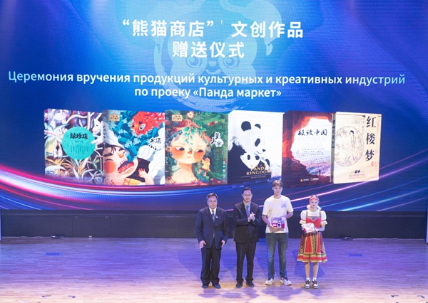 活动现场,中宣部国际传播局局长陈大为、中宣部国际联络局局长操晓理向莫斯科548学校、莫斯科2120学校赠送了首批“熊猫商店”首批文创作品,包含影视节目视频书《红楼梦》《勇敢者的征程》《熊猫王国》《如果国宝会说话》,中国童话故事选集《绿珍珠》《美人树》等。