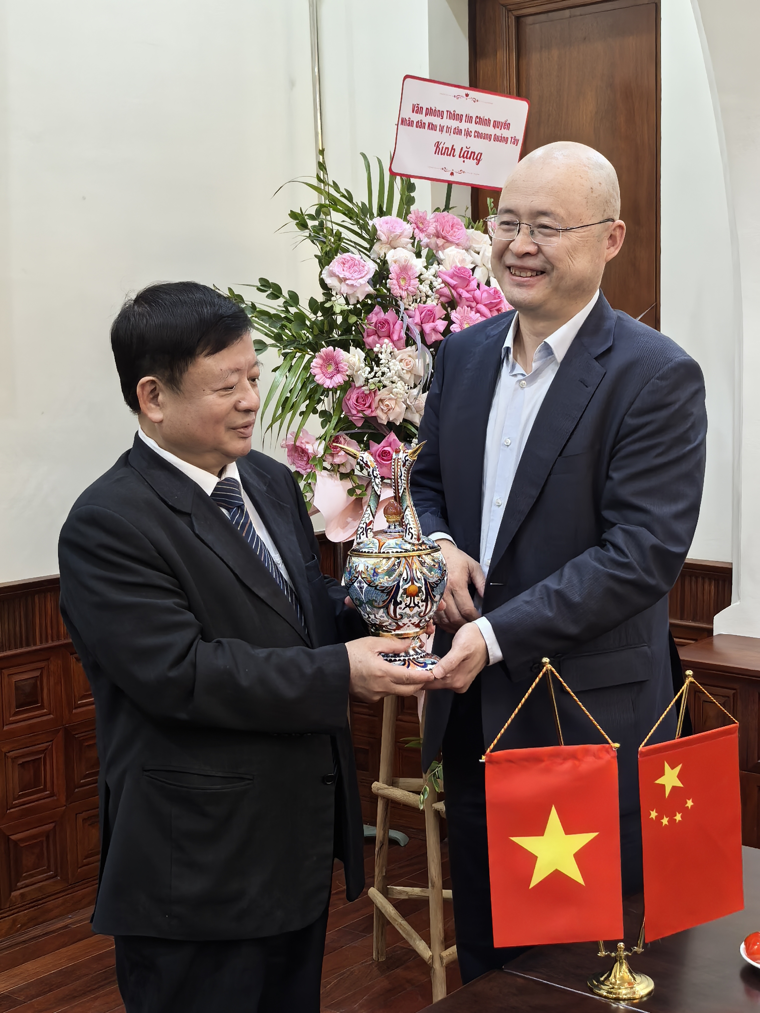 在友好而热烈的活动氛围中,五洲传播中心总编辑井水清代表中方向越南祖国阵线中央委员会副主席、越南文联主席杜洪军赠送了一件承载着深情厚谊的礼物——景泰蓝“三鹤熏”。此件珍贵的礼品由中国工艺美术大师霍铁辉为此次活动特别创作。鹤在中越两国文化中均象征着吉祥、长寿、高贵与和谐,三只鹤的造型也分别代表了中方对于中越两国间文明互鉴、民心相通、和谐友好的期待,希望通过这件礼品传达对于中越建交75周年的美好祝福。