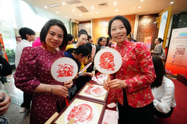 与会嘉宾展示手工麽乜、剪纸等中国非遗作品