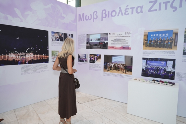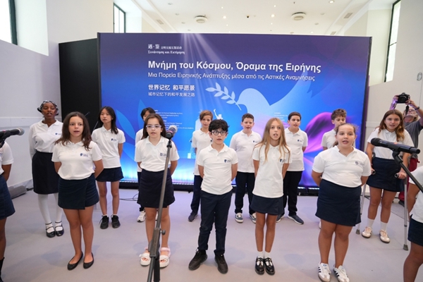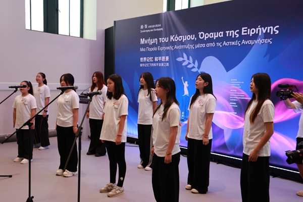 活动伊始,未来世界希腊青少年团体合唱“和平友谊”主题希腊民谣组曲《如果全世界的孩子们》《像这样的手》,未来世界中国青少年团体合唱中国歌曲《让世界充满爱》,清澈的童声回荡在展厅内,为现场奠定了庄重而充满希望的基调。